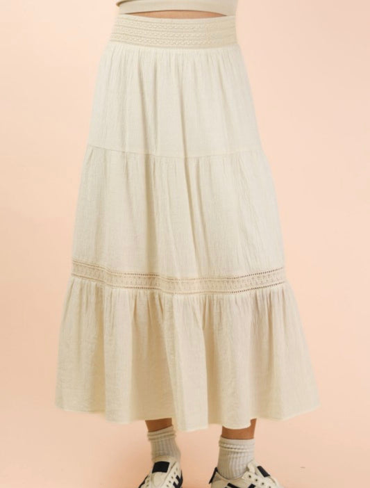 Tiered Woven Maxi Skirt W/ Lace Trim