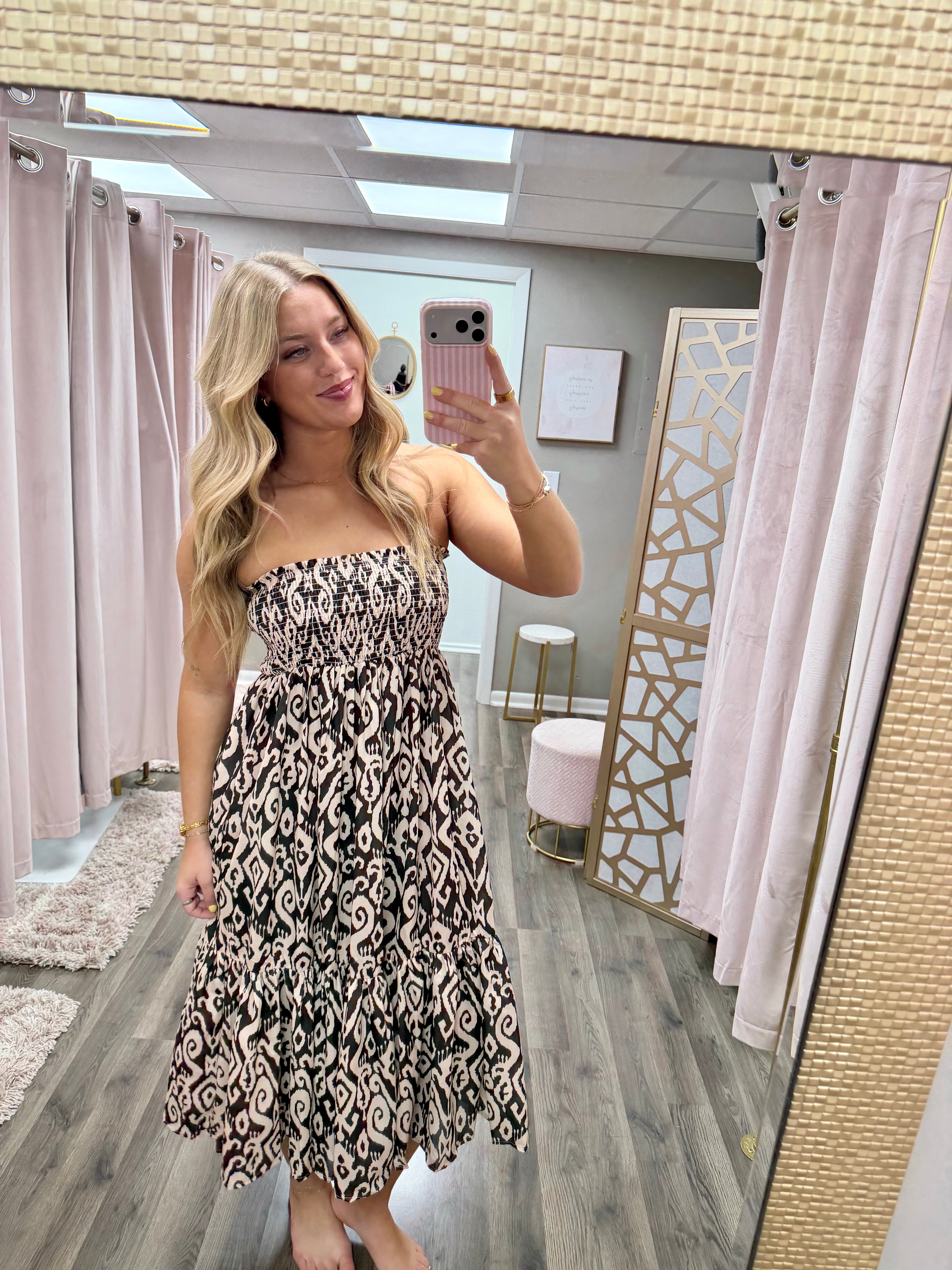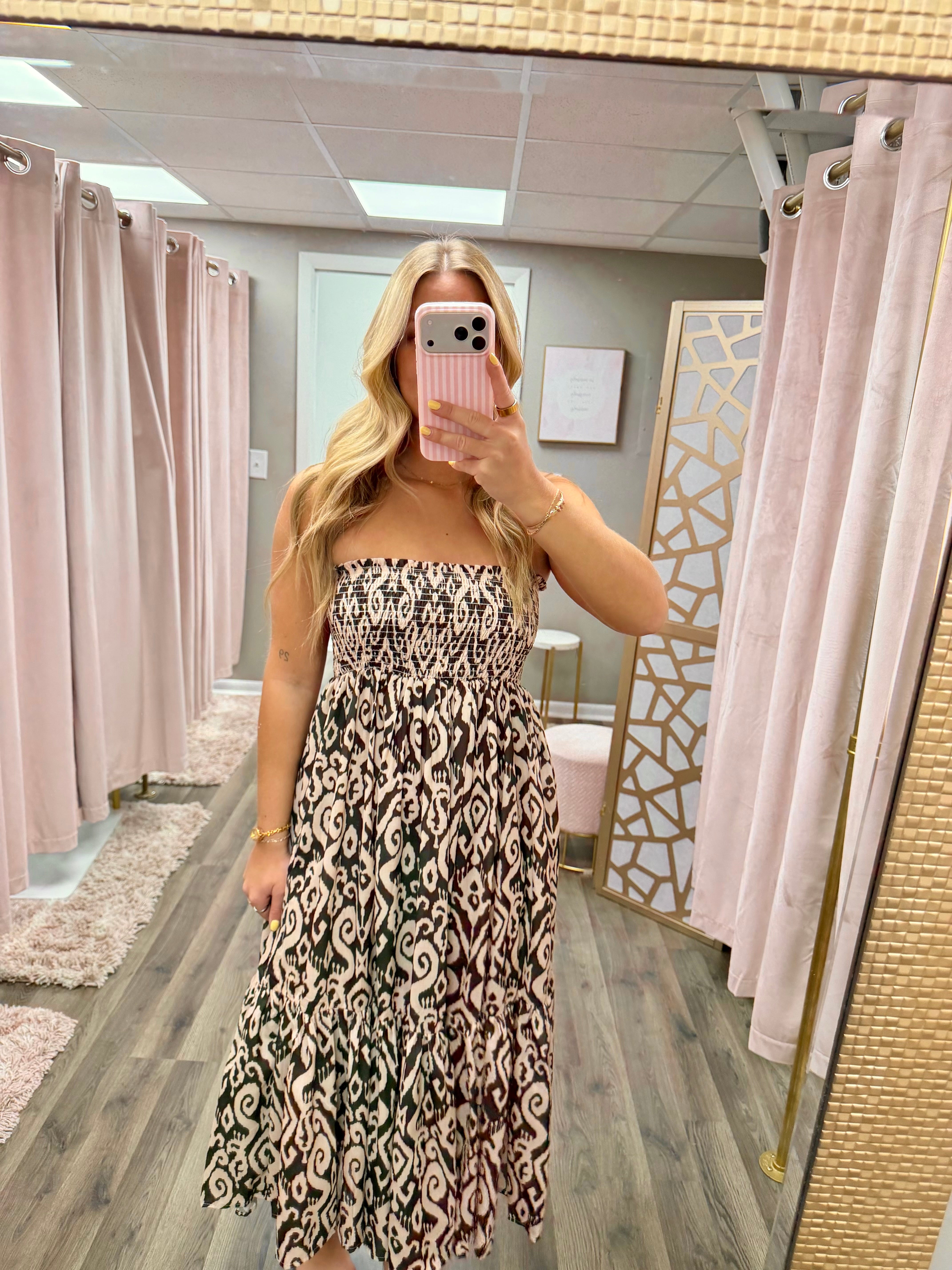 GEO PRINT 2-WAY CONVERTIBLE TIERED MAXI SKIRT - GEO PRINTED WOVEN FABRIC - 2-WAY CONVERTIBLE STYLE ( MAXI SKIRT / STRAPLESS MIDI DRESS ) - SMOCKED WAISTBAND - TIERED