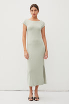 ultra soft, short sleeve, midi length dress featuring a stunning boat neckline & slit