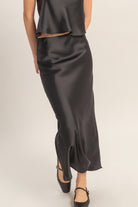 This luxurious satin skirt features a high-waisted fit and a sophisticated bias-draped A-line shape, giving ita subtle, flowing hemline. 100% Polyester