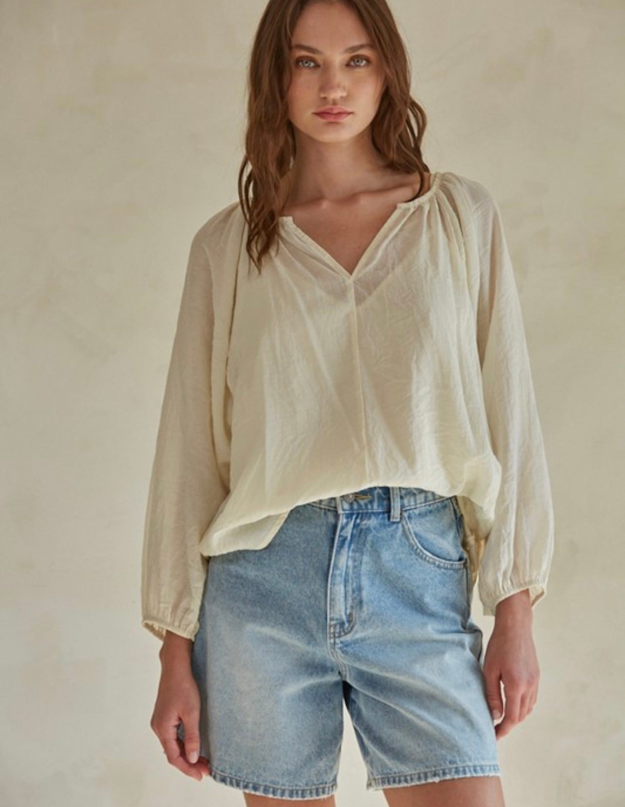 A split neck blouse top is a stylish and versatile piece characterized by a subtle neckline opening that creates a "V" shape at the front. This neckline is not fully closed, providing a relaxed, flattering fit. The blouse features soft, flowy fabric and has long sleeves. The split neck design adds a modern touch to the top, making it perfect for both casual and slightly more formal occasions.