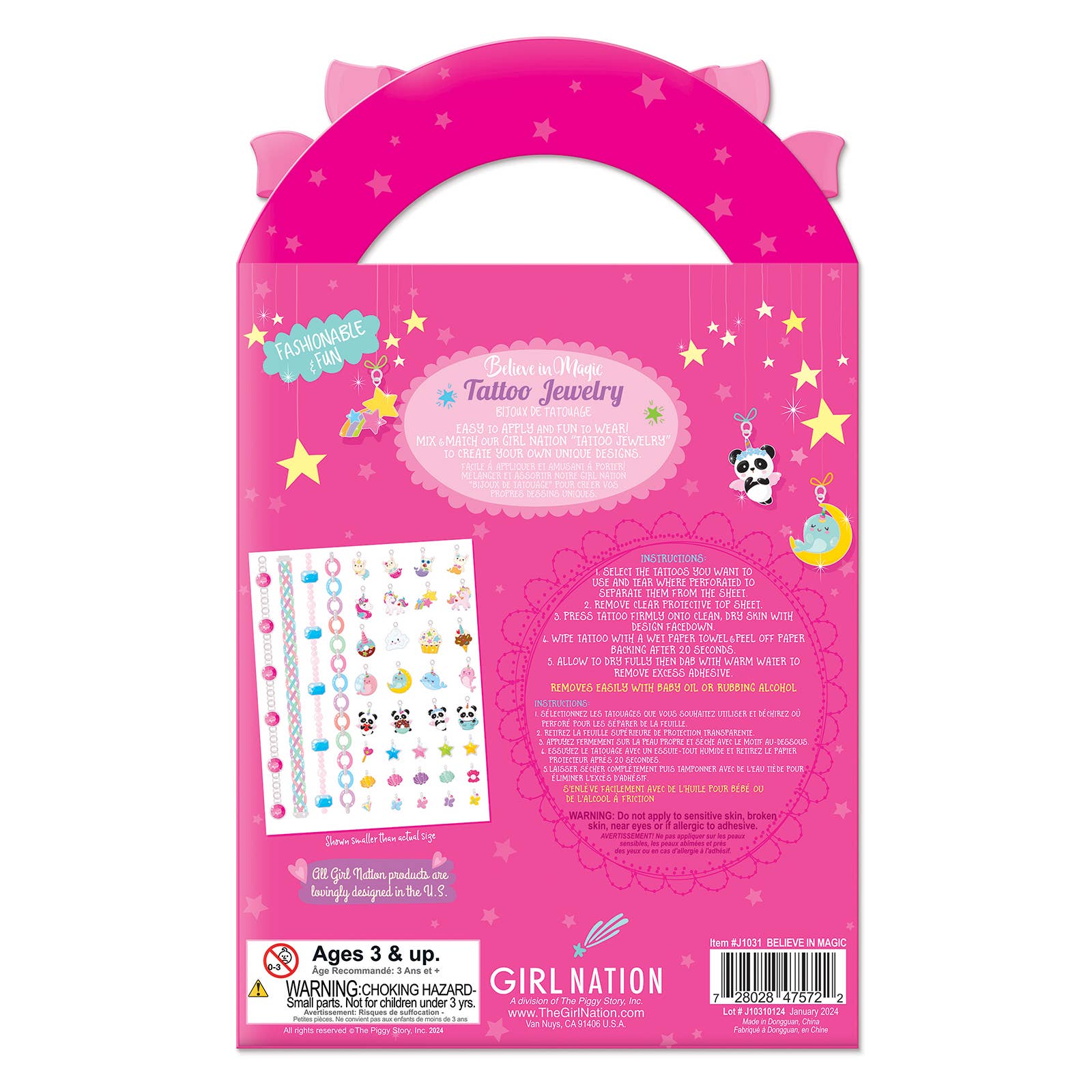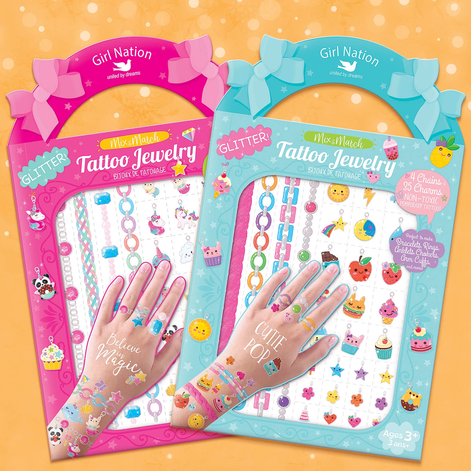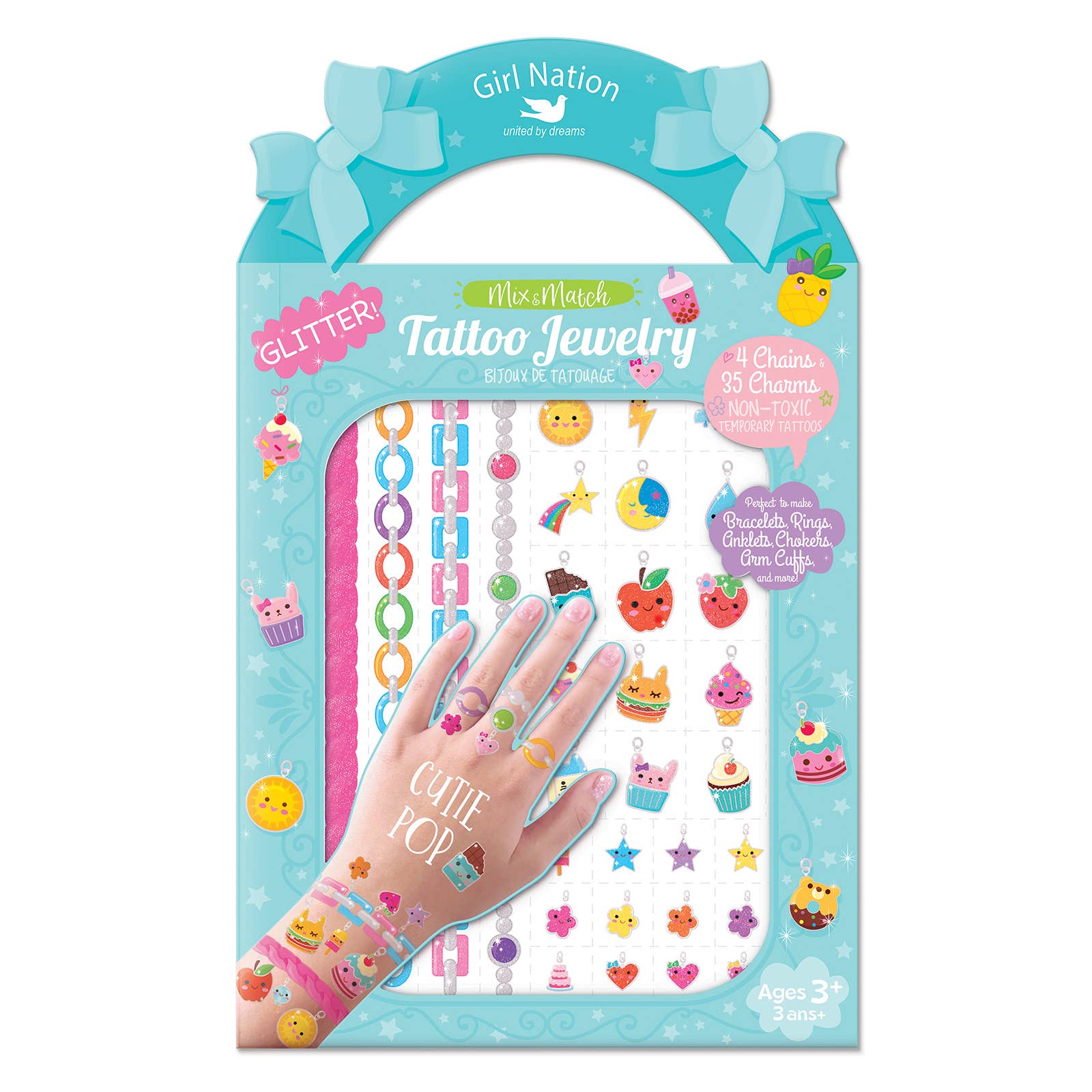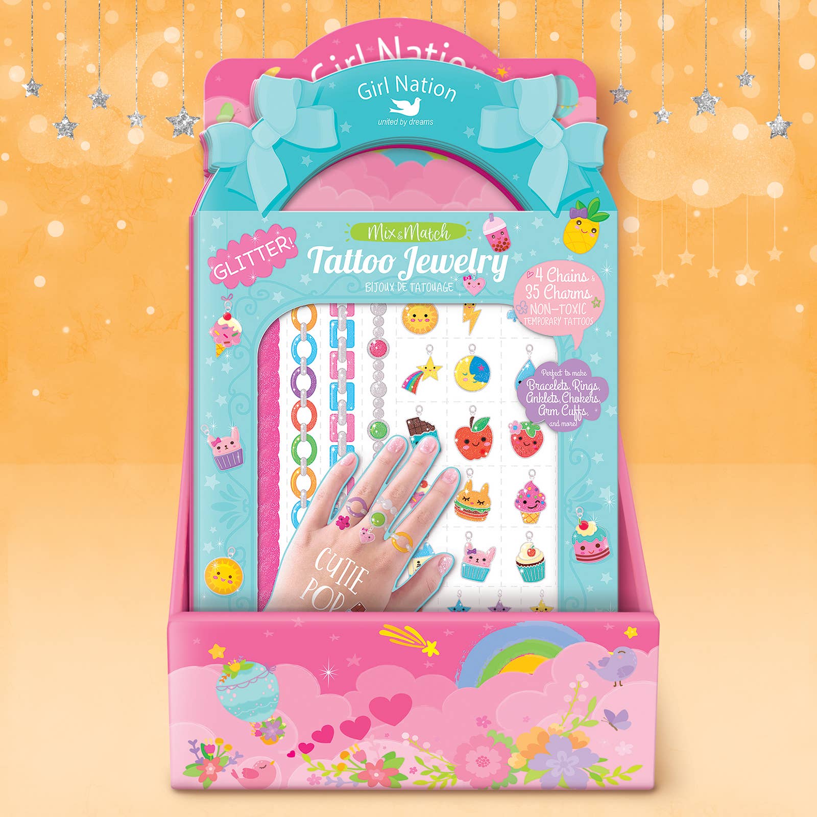 Temporary Tattoos! Easy to apply and fun to wear! Mix & Match Girl Nation "Tattoo Jewelry" to create your own unique designs. Perfect for Birthday Gifts for Kids, Party Favors, Easter Baskets, Stocking Stuffers and more! Fashionable and fun, each pack includes 4 chains and 35 charms to create your own glittery Bracelets, Anklets, Chokers, Arm Cuffs Rings and more! Use a wet paper towel for easy application. Remove with baby oil or rubbing alcohol. Intended for ages 3-7. Not intended for children under 3. Measurements of assembled display: 9.5"h x 8"l x 5.5"w