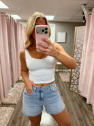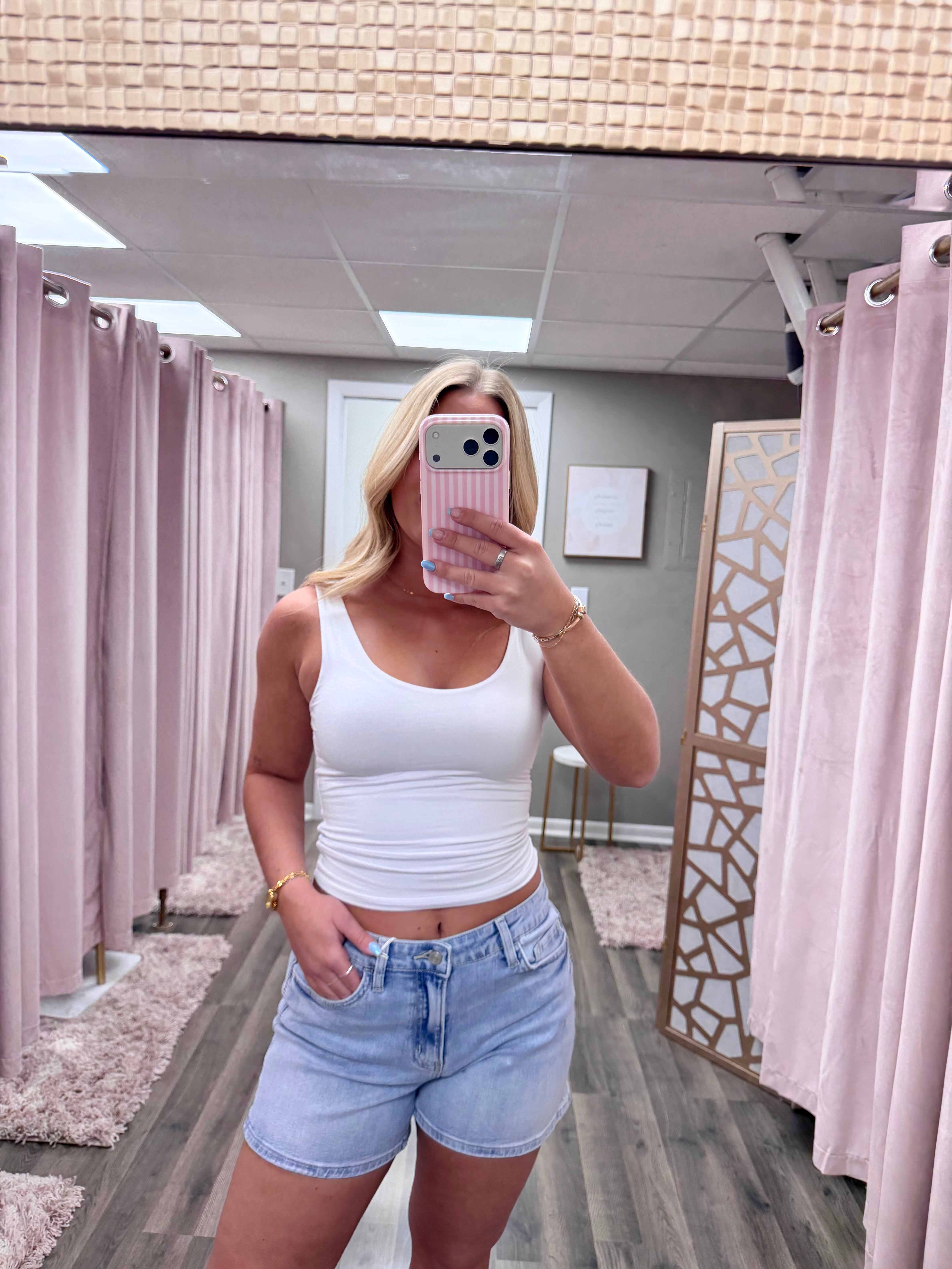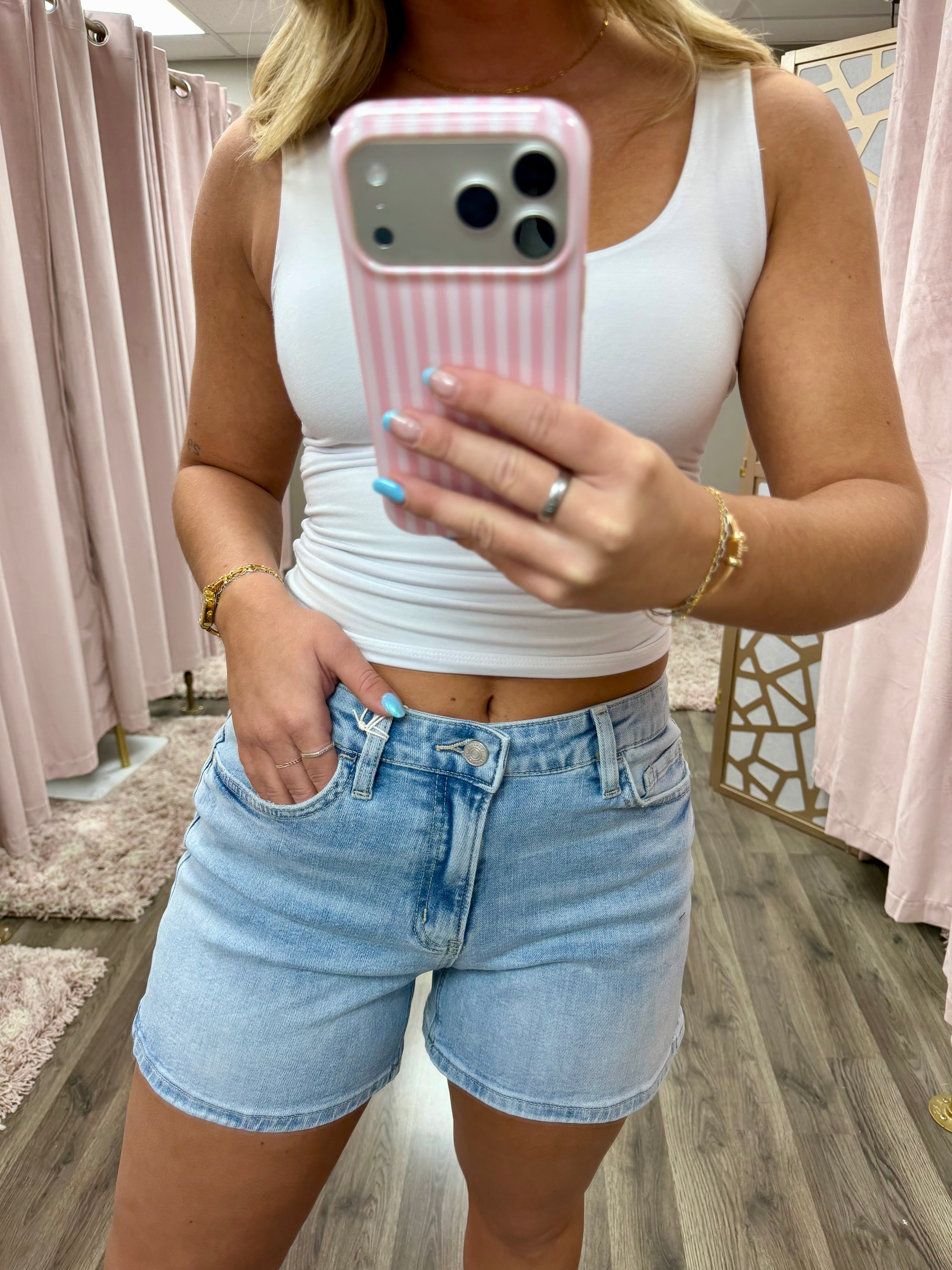 HIGH RISE MEDIUM LIGHT WASH DENIM SHORTS COMFORT STRETCH DENIM, HIGH RISE WAIST, 5 POCKETS, LIGHTLY DISTRESSED DETAIL, FINISHED HEM, LIGHT WASH, DENIM SHORTS F. RISE: 10" / INSEAM: 4 1/2" / LEG OPENING: 23 3/4"