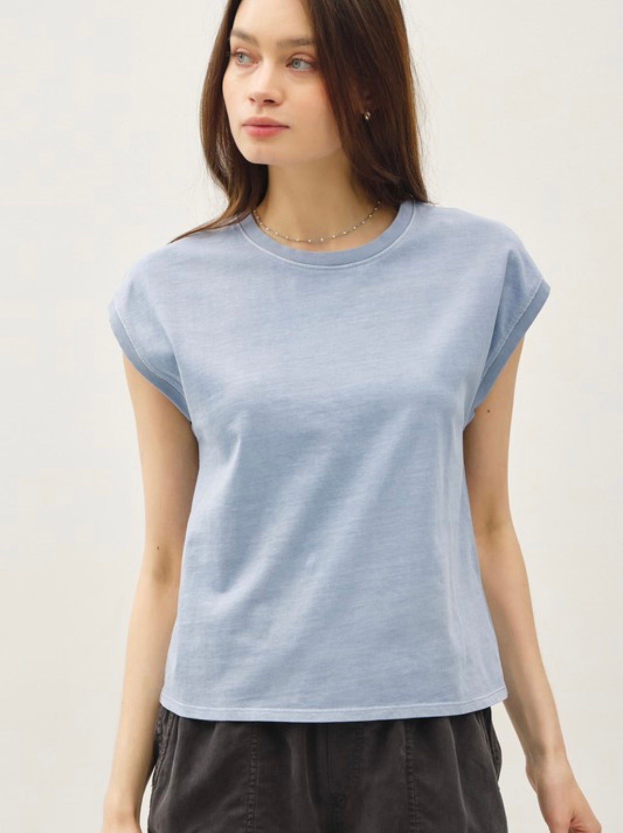 A versatile and essential basic cap sleeve tee, crafted for everyday comfort and effortless style. This tee features short, cap-style sleeves that offer a bit more coverage than traditional short sleeves, providing a flattering and feminine fit. Made from soft, breathable fabric, it ensures all-day comfort while maintaining a casual, relaxed look.