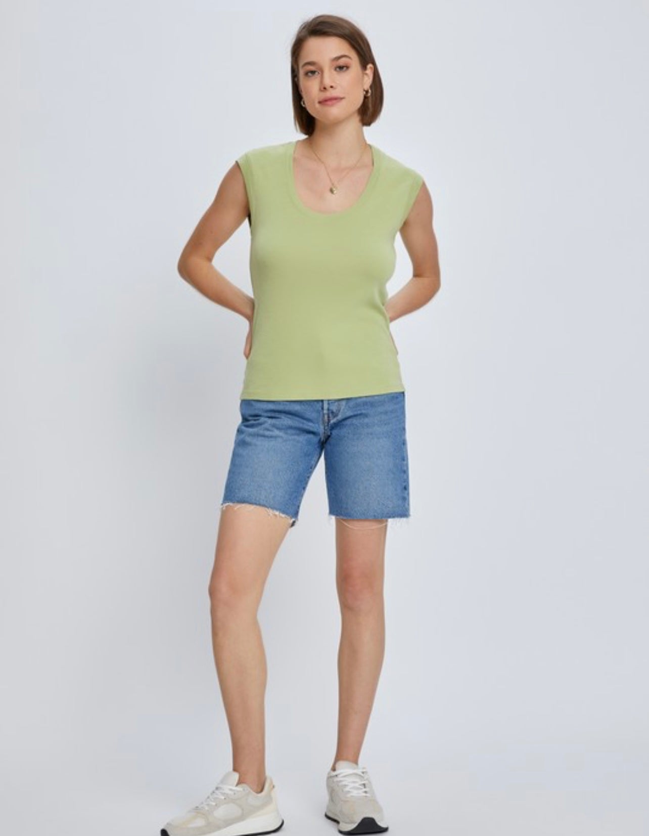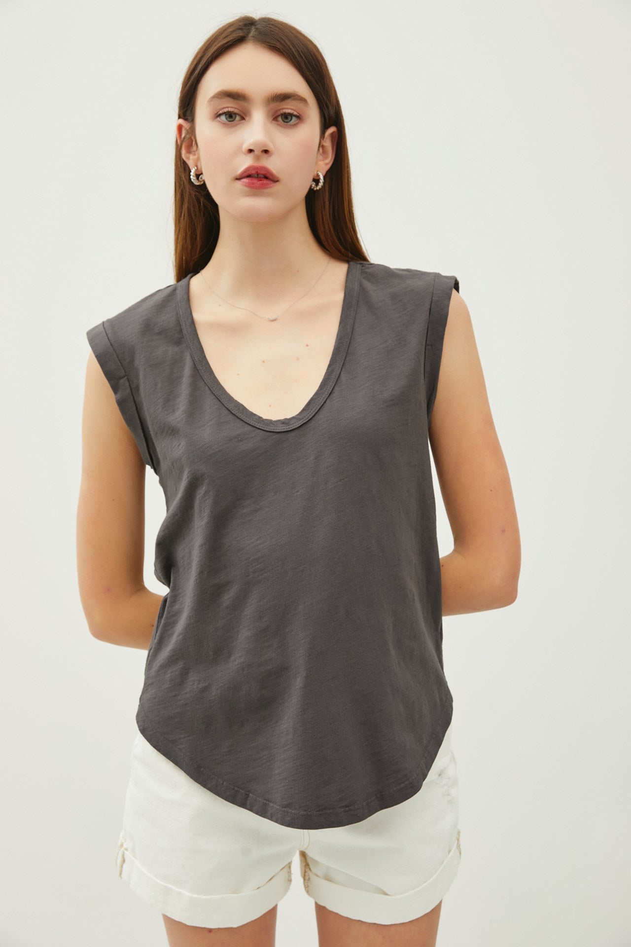 A basic scoop neck cap sleeve top features a rounded, flattering neckline that dips slightly in the front, creating a soft, feminine shape. The cap sleeves provide a light, airy coverage, sitting just above the shoulder, offering a comfortable and versatile design.