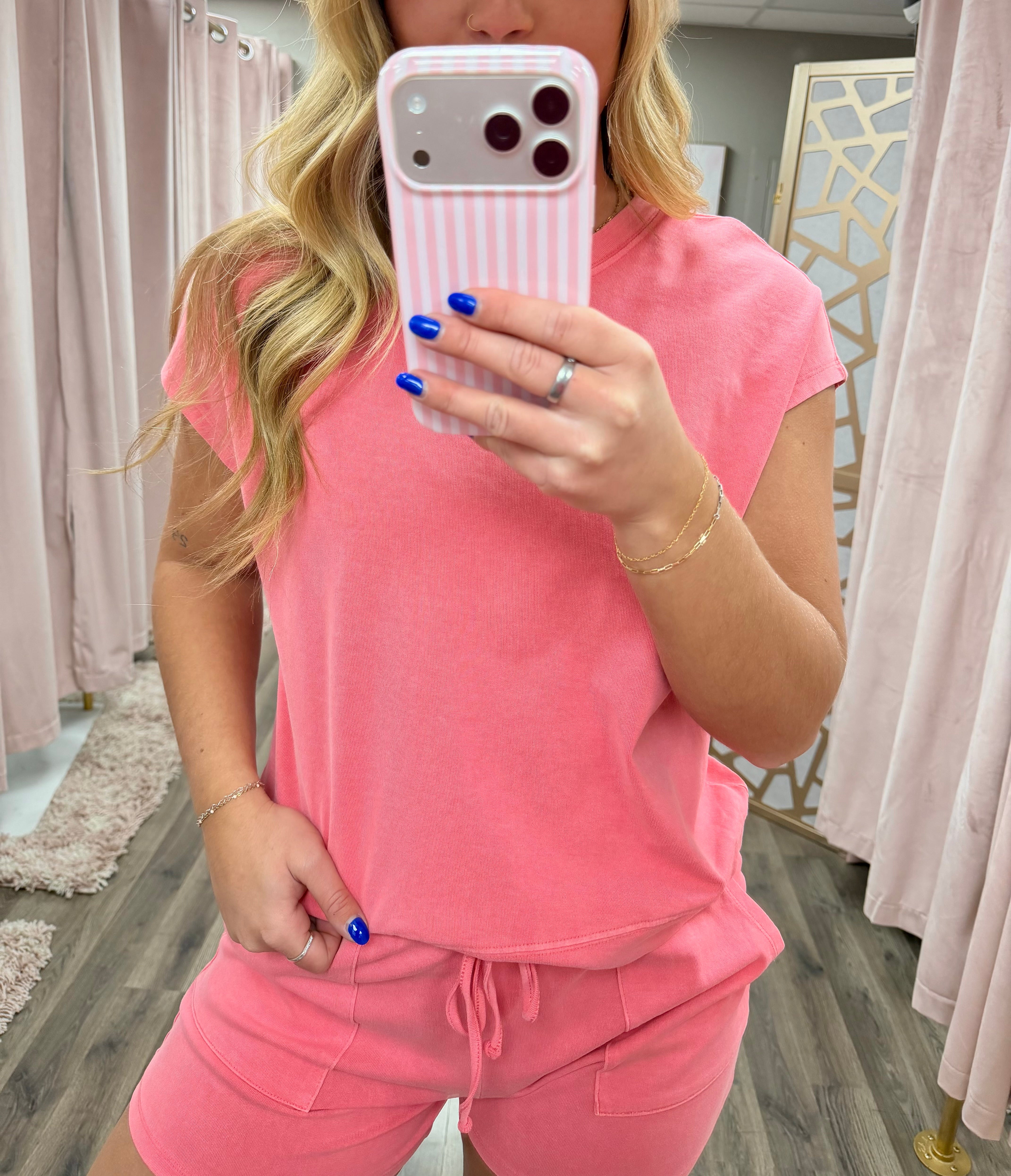 at the hem along with mid-rise shorts that feature