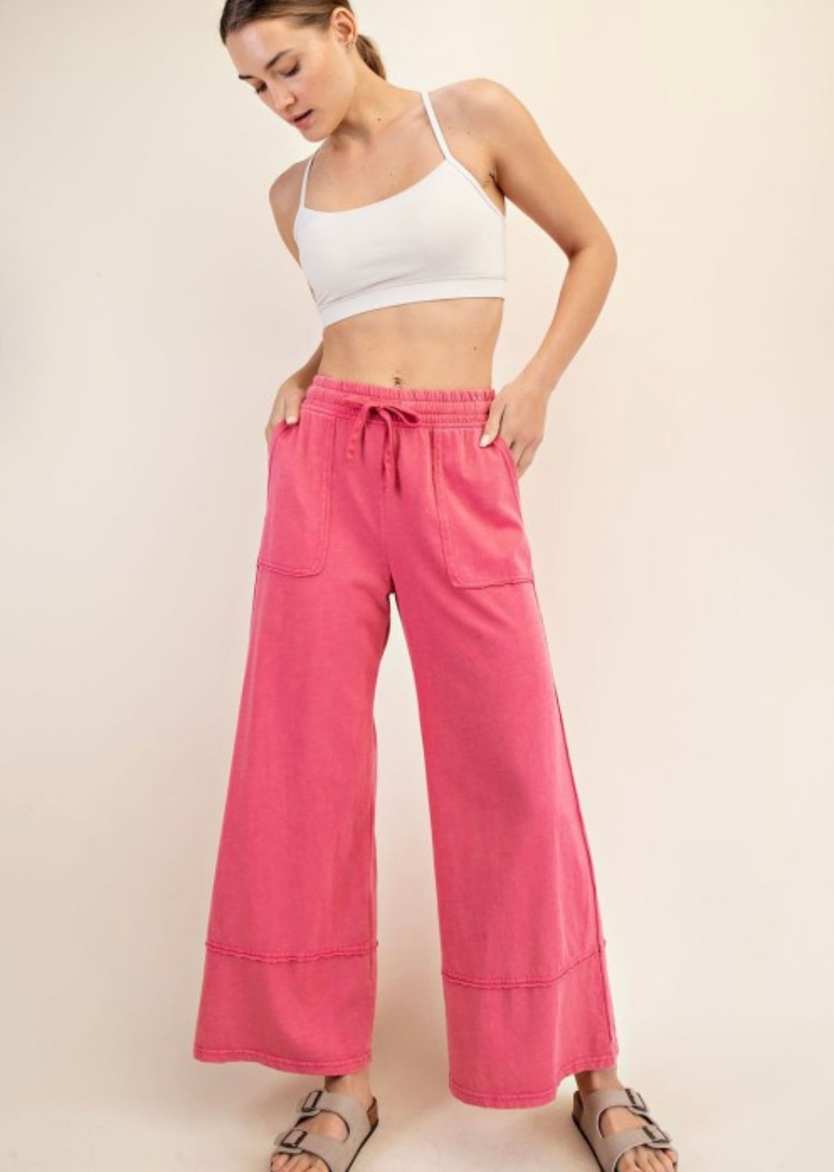 Effortlessly cool and ultra-comfy, these cotton cropped wide leg pants are your go-to for laid-back style. Made from breathable cotton, they feature a high-rise fit with a relaxed silhouette and ankle-grazing length. The wide leg design adds a modern touch, while an elastic waistband ensures all-day comfort. Perfect for pairing with tanks, tees, or tucked-in blouses for an easy, everyday look.