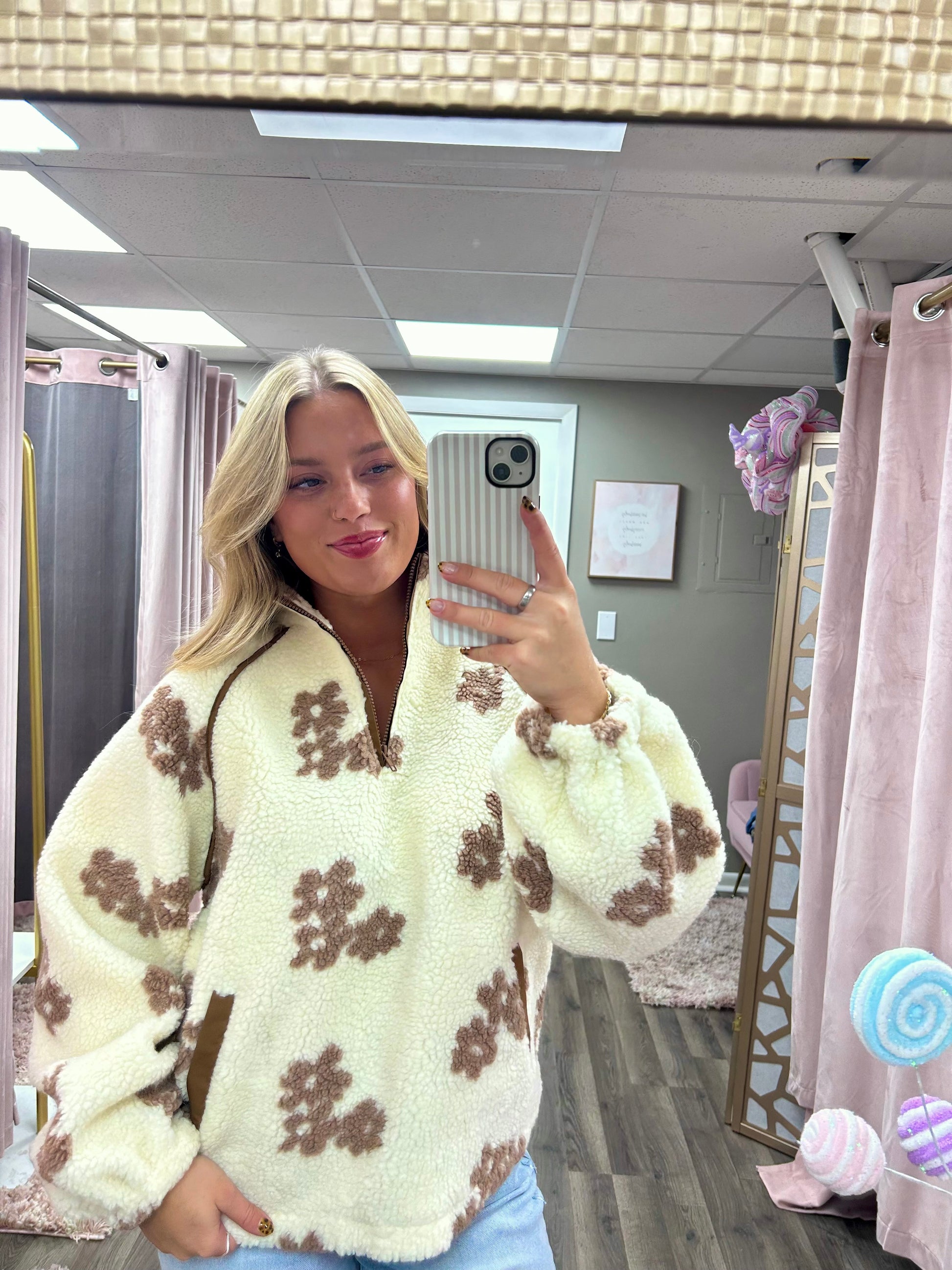 FLOWER PRINTED SHERAPA FRONT ZIP UP TOP WITH SIDE POCKET
